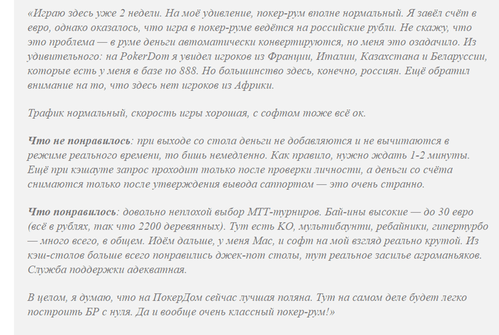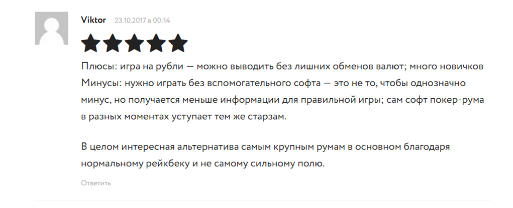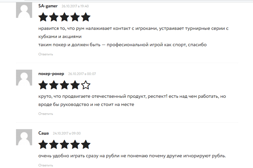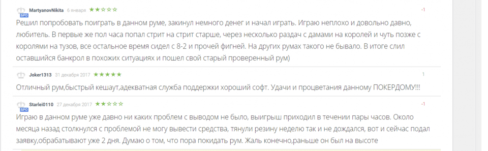 Отзывы о российской комнате в сети представлены в изобилии. Есть и положительные и негативные мнения. Как показывает практика, отрицательные комментарии чаще всего оставляют те игроки, которые проиграли весь банкролл из-за собственных ошибок и теперь пытаются свалить вину на комнату. К тому же, большинство негатива носит необъективный характер, поэтому доверять им слепо не стоит.